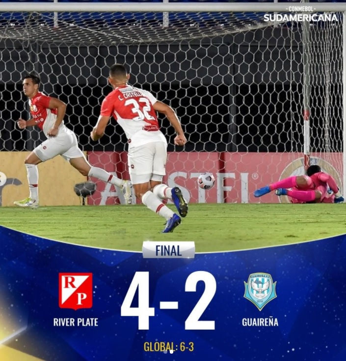 🏆🇵🇾 River Plate ganó 4⃣-2⃣ como local, eliminó a Guaireña y se metió en la Fase de Grupos de la Conmebol Sudamericana 2021. Pablo Zeballos, Marcelo Gonzalez, Diego Godoy y Luis Caballero anotaron para River, mientras que Feliciano Brizuela y José Verdún descontaron para Guaireña.